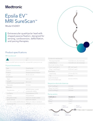 The Epsila EV™ MRI SureScan™ defibrillation lead is an MR Conditional lead approved for use when an extravascular implantable cardioverter defibrillator is indicated to treat tachycardia.