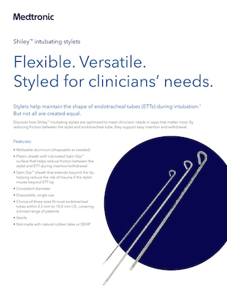 <p>The Shiley™ intubating stylet helps reduce friction between the stylet and the endotracheal tube for easy insertion and withdrawal.</p>