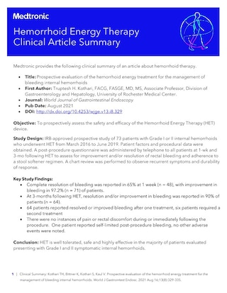 3. Kothari TH, Bittner K, Kothari S, Kaul V. Prospective evaluation of the hemorrhoid energy treatment for the management of bleeding internal hemorrhoids. World J Gastrointest Endosc. 2021;16;13(8):329335.