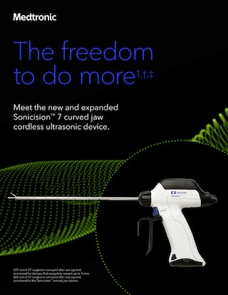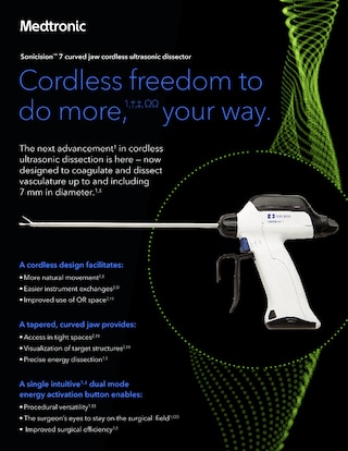 <p>The Sonicision™ 7 curved jaw ultrasonic dissector is a cordless device capable of coagulating and dissecting vessels.</p>