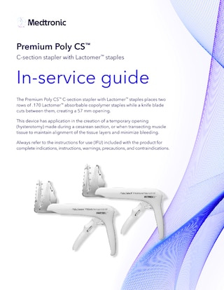 <p>Premium Poly CS™ staplers place two rows of Lactomer™ absorbable copolymer staples while a knife blade cuts between them, creating a 57 mm opening.</p>